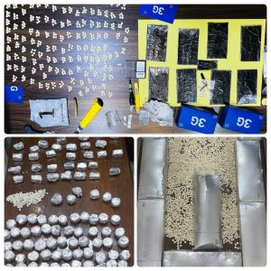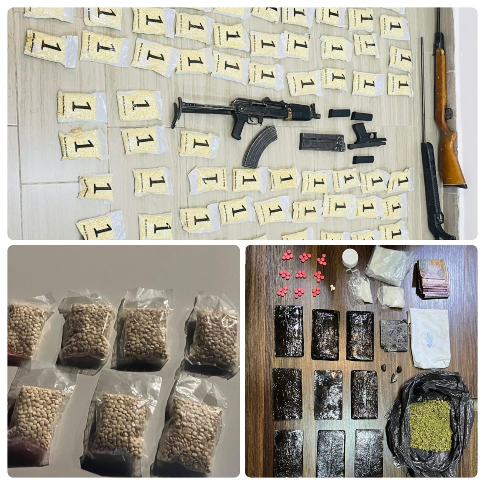 وفي القضية التالية دوهم في لواء الرويشد / منشية الغياث، مجموعة من الأشخاص بعد ورود معلومات حول تخزينهم لكميات كبيرة من الحبوب المخدرة وأُلقي القبض على أربعة أشخاص كانوا بالموقع وضُبط بحوزتهم 125 ألف حبة مخدرة وسلاحان ناريان .