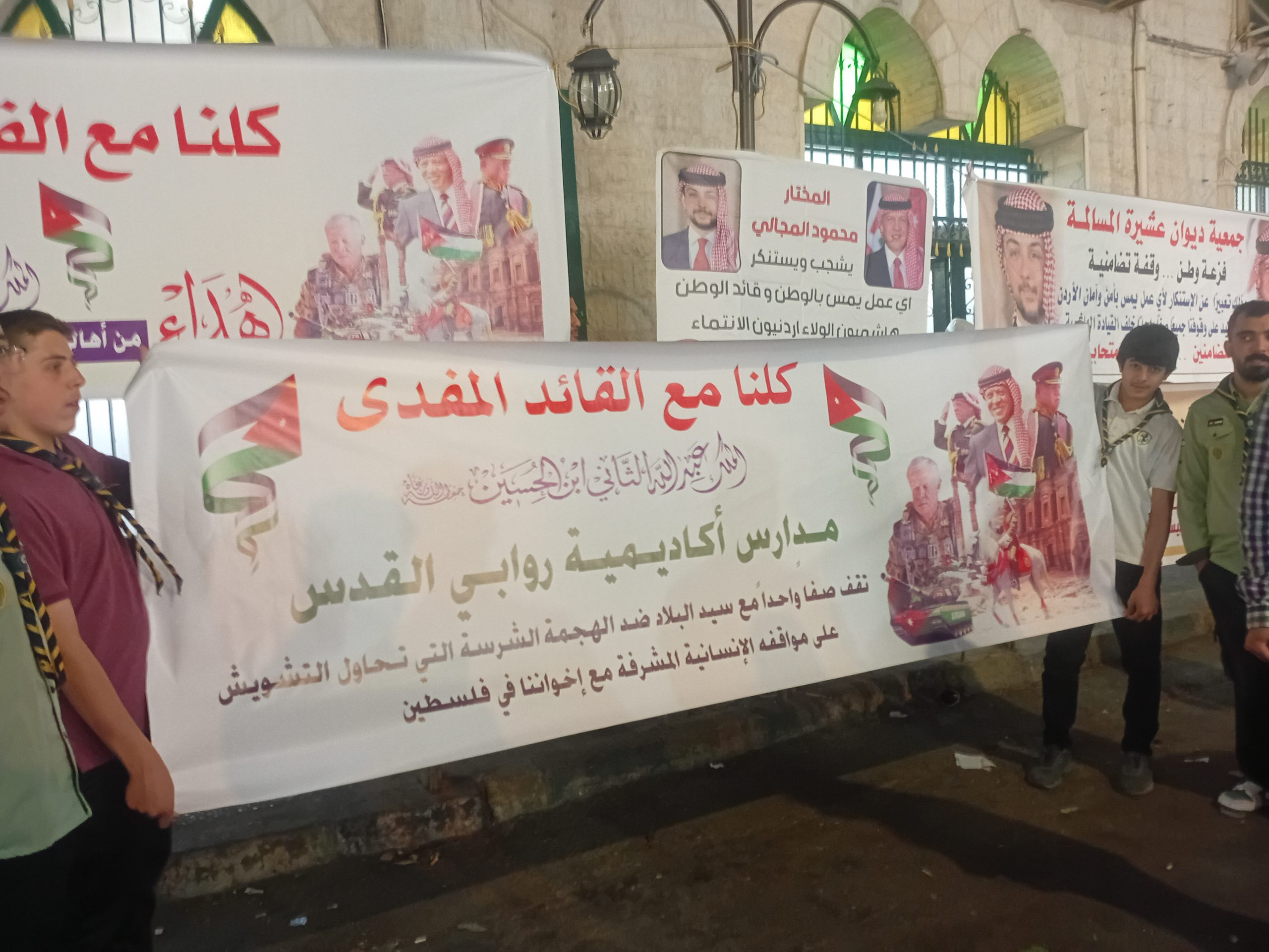 شبكة الشرق الأوسط نيوز – محيي الدين غنيم : أقام أهالي حي نزال/ الياسمين اليوم الإثنين، بالقرب من مسجد حي نزال الكبير، وقفة تضامنية مغ جلالة الملك عبدالله الثاني ابن الحسين حفظه الله ورعاه ضد الهجمة الممنهجة ضد الأردن والتقليل من الدور الإنساني والدبلوماسي تجاه اهلنا في قطاع غزة ؛ وسط حضور متميز من أهالي حي نزال والسادة النواب لمنطقة حي نزال الحاليين والسابقين وشيوخ ووجهاء حي نزال .