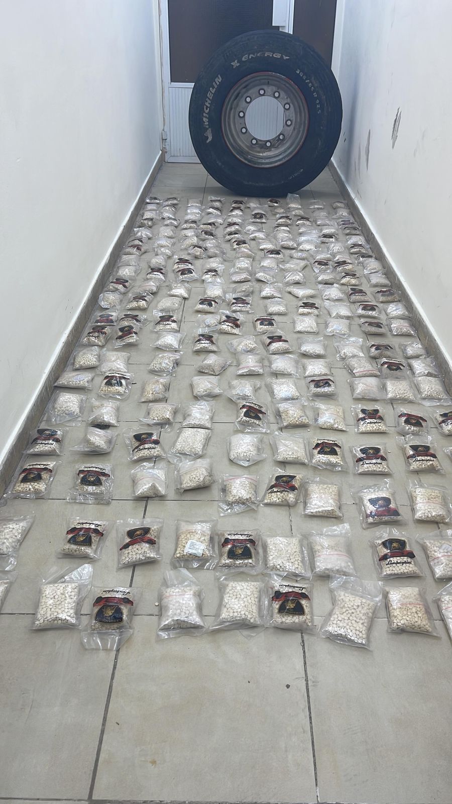 إدارة مكافحة المخدرات تُحبط محاولة تهريب 200 ألف حبّة مخدرة داخل إطار مركبة شحن