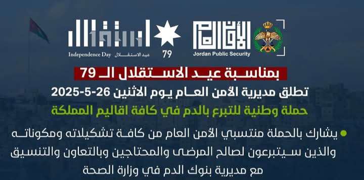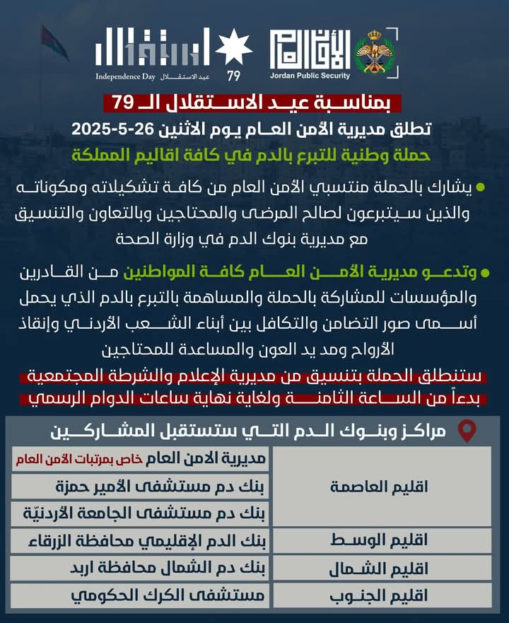 بمناسبة عيد الاستقلال الــ79 تطلق مديرية الأمن العام يوم غدٍ الاثنين 26-5-2025 حملة وطنية للتبرع بالدم في كافة اقاليم المملكة