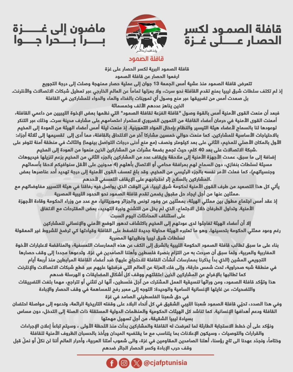 هذا وتؤكد قافلة الصمود، ومن ورائها تنسيقية العمل المشترك من أجل فلسطين، أنّها لن تنثني أو تتراجع، مهما بلغت التضييقات والتضحيات، عن غايتها الإنسانية السامية والوحيدة: التوجه إلى معبر رفح للمساهمة في وقف الحصار والإبادة في حق شعبنا الفلسطيني الصامد في غزة.