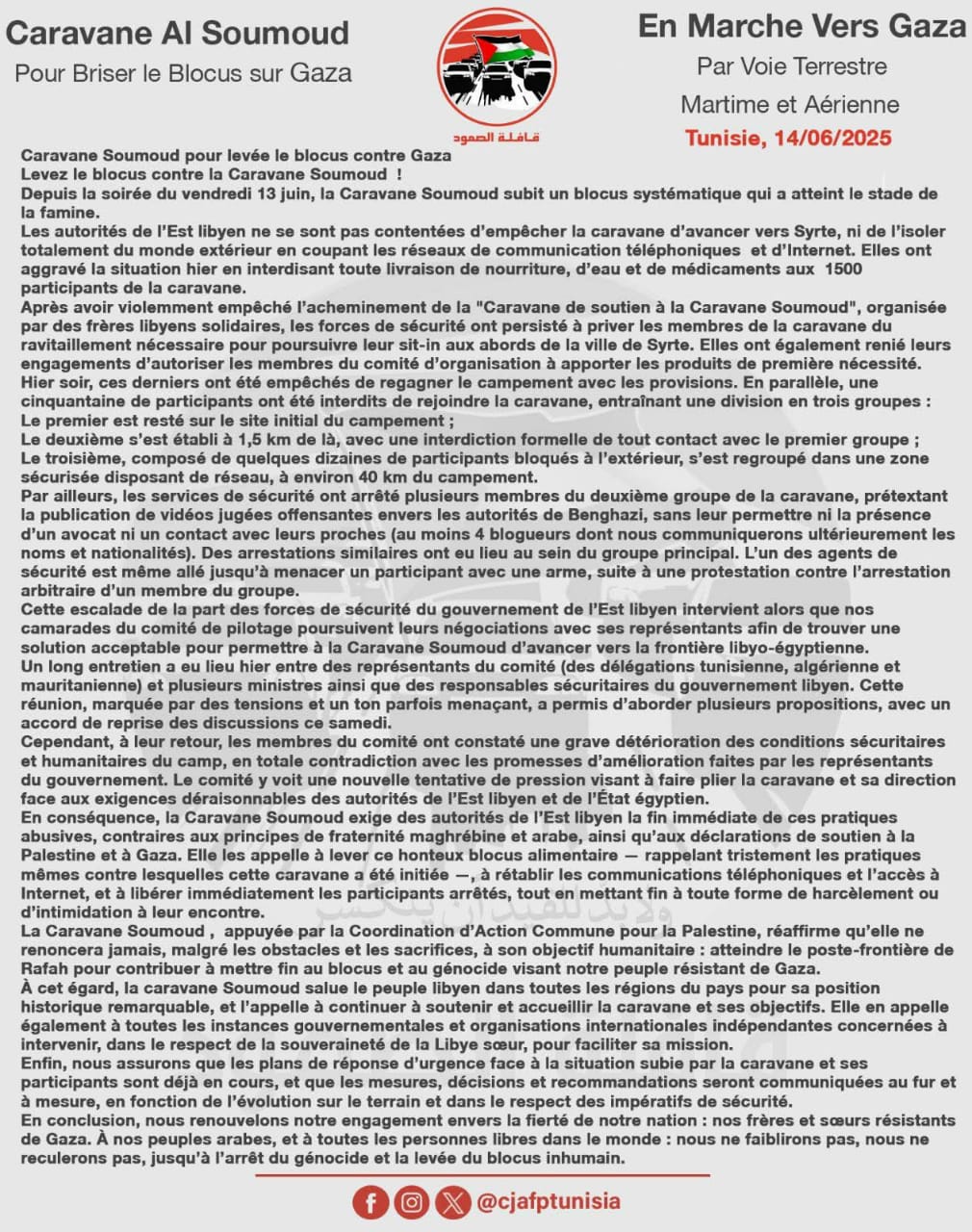 La Caravane Soumoud , appuyée par la Coordination d’Action Commune pour la Palestine, réaffirme qu’elle ne renoncera jamais, malgré les obstacles et les sacrifices, à son objectif humanitaire : atteindre le poste-frontière de Rafah pour contribuer à mettre fin au blocus et au génocide visant notre peuple résistant de Gaza.