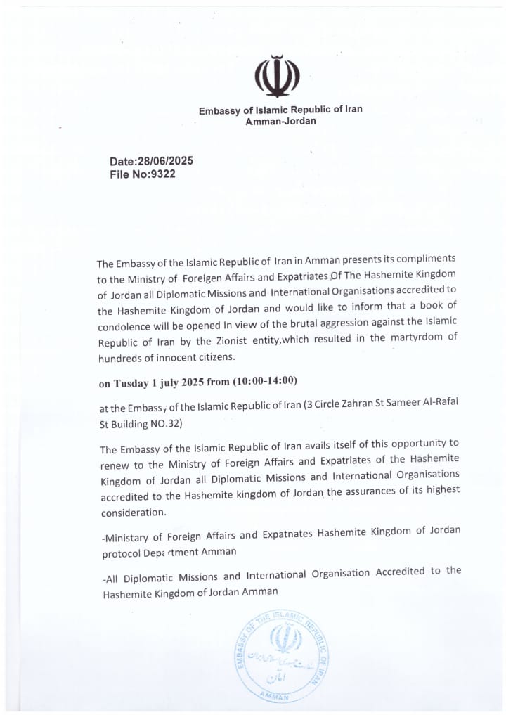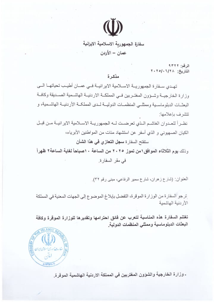 سفارة الجمهورية الإسلامية الإيرانية في عمان تفتتح سجل التعازي بضحايا العدوان الإسرائيلي الثلاثاء