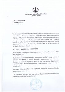 شبكة الشرق الأوسط نيوز : تعرب سفاره الجمهوريه الاسلاميه الايرانيه في عمان عن بالغ الحزن والأسى إزاء العدوان الغاشم للكيان الصهيوني الذي استهدف الجمهوريه الإسلاميه الايرانيه و أودى بحياة المئات من المواطنين الأبرياء.