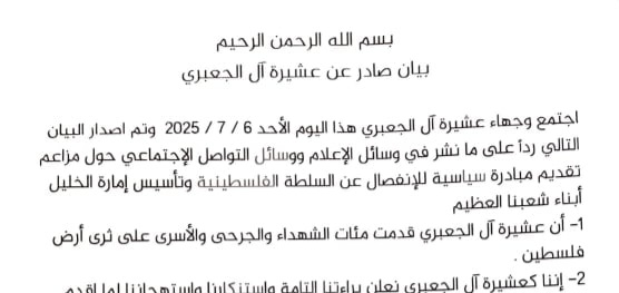 وختمت العشيرة بيانها بالتأكيد أن هذا هو “موقف عشيرة الجعبري في الحاضر والمستقبل، ولن نحيد عنه مهما كانت الظروف”، داعية وسائل الإعلام إلى توخي الدقة، وعدم الانجرار خلف بيانات فردية لا تعبّر عن الموقف الجمعي للعائلة.
