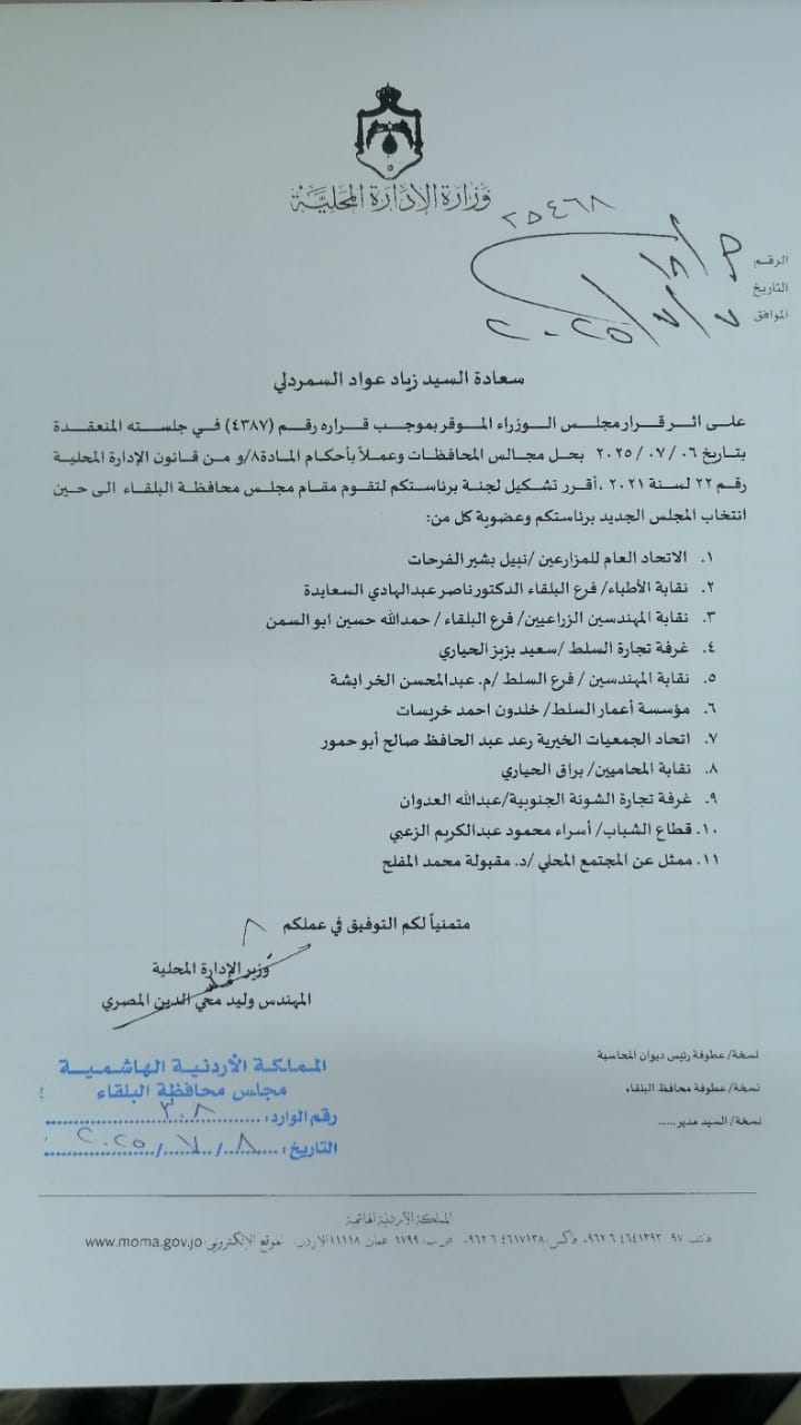 زياد السمردلي رئيساً للجنة إدارة مجلس محافظة البلقاء بعد قرار حل المجلس