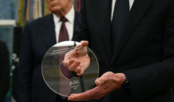 وبعدما قطع وعدًا باستثمار إضافي بقيمة 100 مليار دولار في الولايات المتحدة، قدّم رئيس الشركة للرئيس هدية تحمل شعار “صُنع في الولايات المتحدة”.