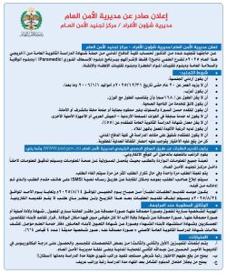 مركز تجنيد الأمن العام يعلن عن حاجتها لتجنيد عدد من الذكور لحساب كلية الدفاع المدني