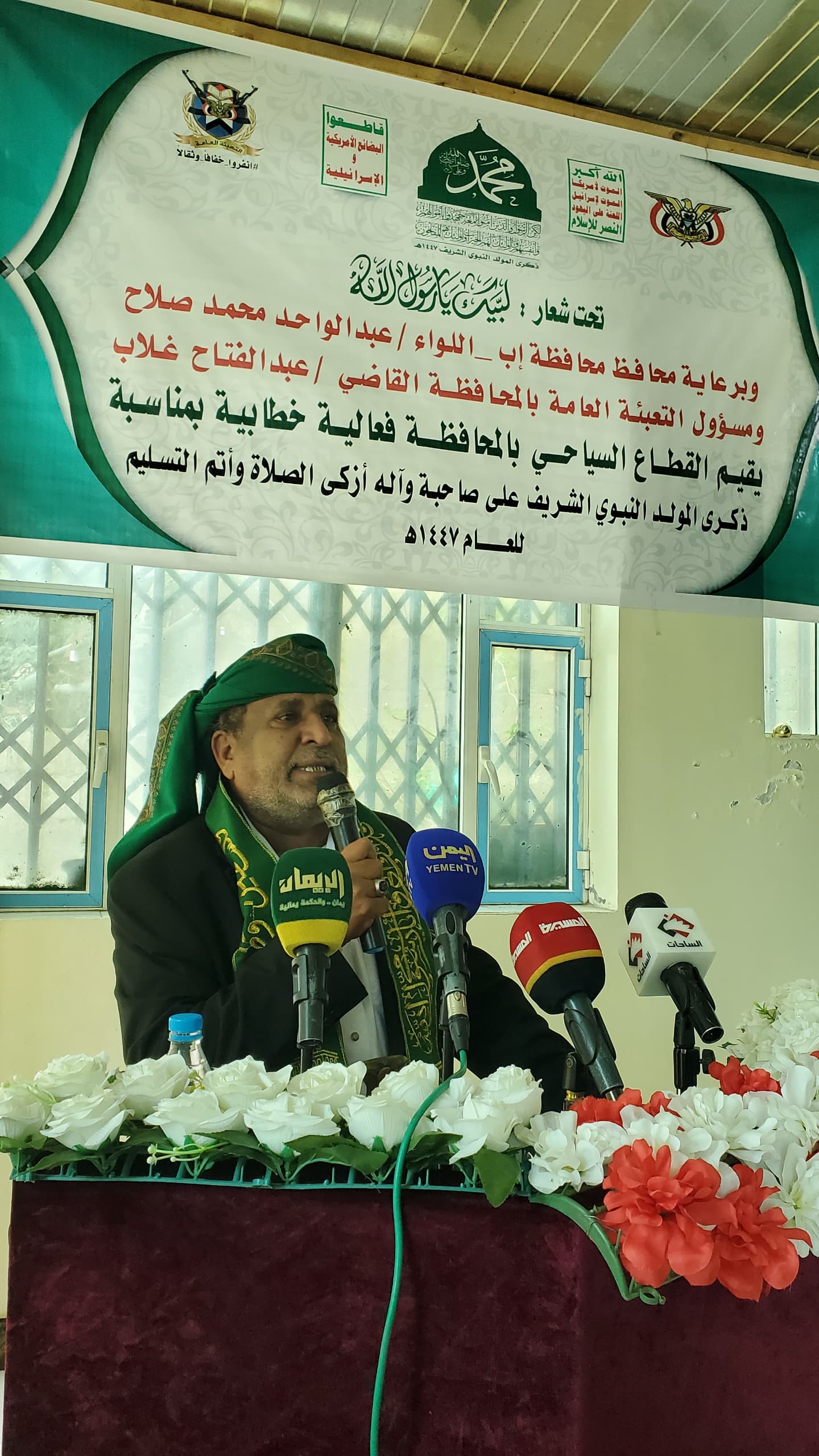 بدوره أكد مدير عام مكتب السياحة بالمحافظة غانم عوسح، أن الاحتفال بذكرى المولد النبوي هذا العام، يعزز من موقف أهل الإيمان والحكمة في مواجهة الأعداء ضمن معركة الفتح الموعود والجهاد المقدس نصرة لمظلومية الأشقاء في قطاع غزة وفلسطين.