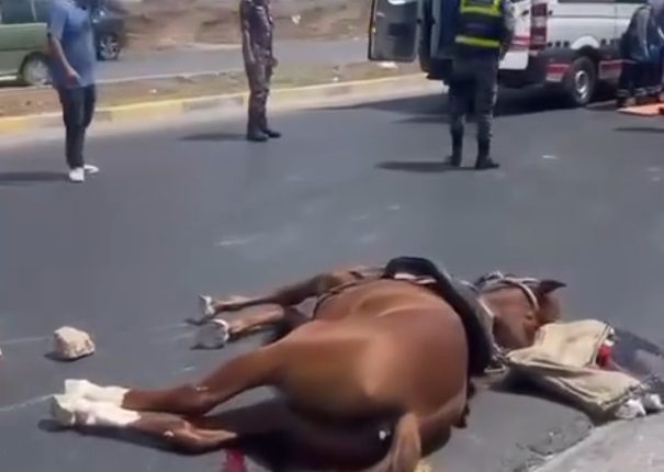 وقال شهود عيان إن الحصان كان يتجول بالقرب من الطريق قبل أن تصدمه إحدى المركبات ما أدى إلى إصابته بجروح بليغة وحرجة .