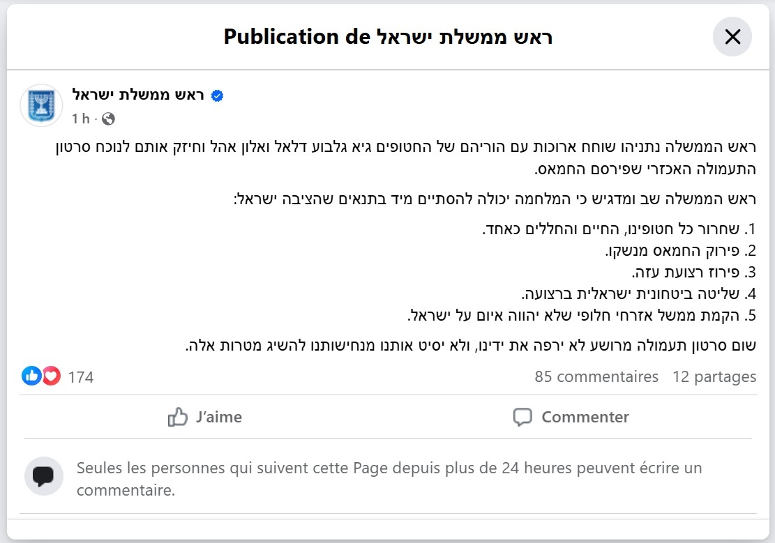 ونشر رئيس الوزراء الإسرائيلي، مساء الجمعة، 5 شروط لوقف الحرب على غزة، مضيفا لأول مرة شرط نزع سلاح القطاع.