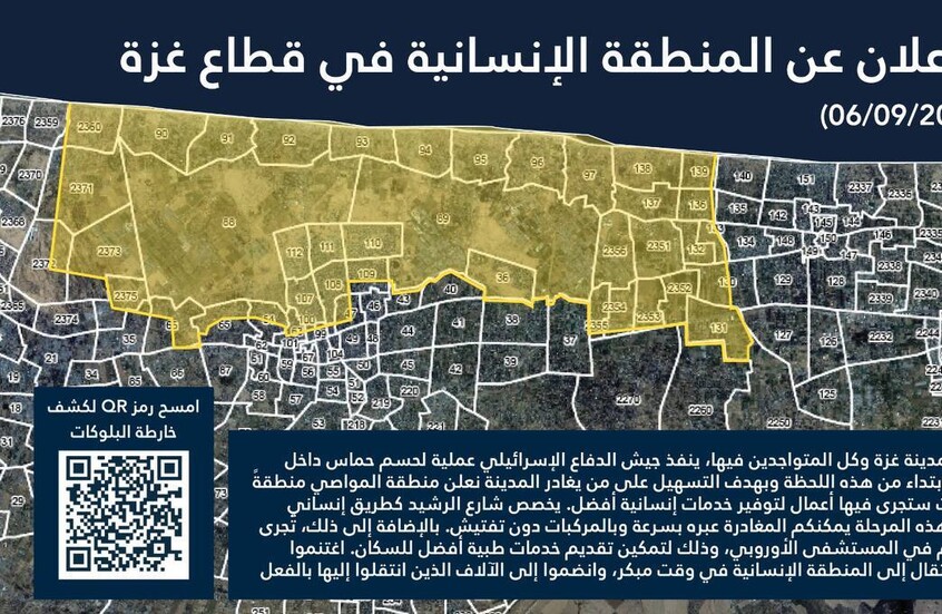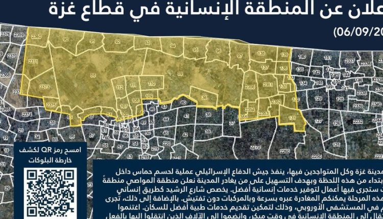 وقال الجيش الإسرائيلي في بيان، “ينفذ الجيش الإسرائيلي عملية لحسم حماس داخل مدينة غزة، وابتداء من هذه اللحظة وبهدف التسهيل على من يغادر المدينة نعلن منطقة المواصي منطقة إنسانية حيث ستجرى فيها أعمال لتوفير خدمات إنسانية أفضل”.