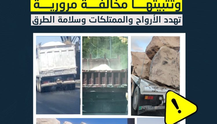 وأوضحت أن تساقط الحمولات، او تطايرها بسبب عدم التأكد من تثبيتها وتحميلها بطريقة آمنة، قد يتسبب بحوادث خطيرة، لافتة إلى أن تطاير الجسيمات من هذه الحمولات يحولها إلى مقذوفات تفاجئ السائقين وتربكهم، عدا عن مخاطر حجب الرؤية عن السائقين بسبب الحمولات المرتفعة، والأضرار البيئية الناجمة عن تسرب المواد الصلبة أو السائلة أو سقوطها على الطرق والأماكن العامة.