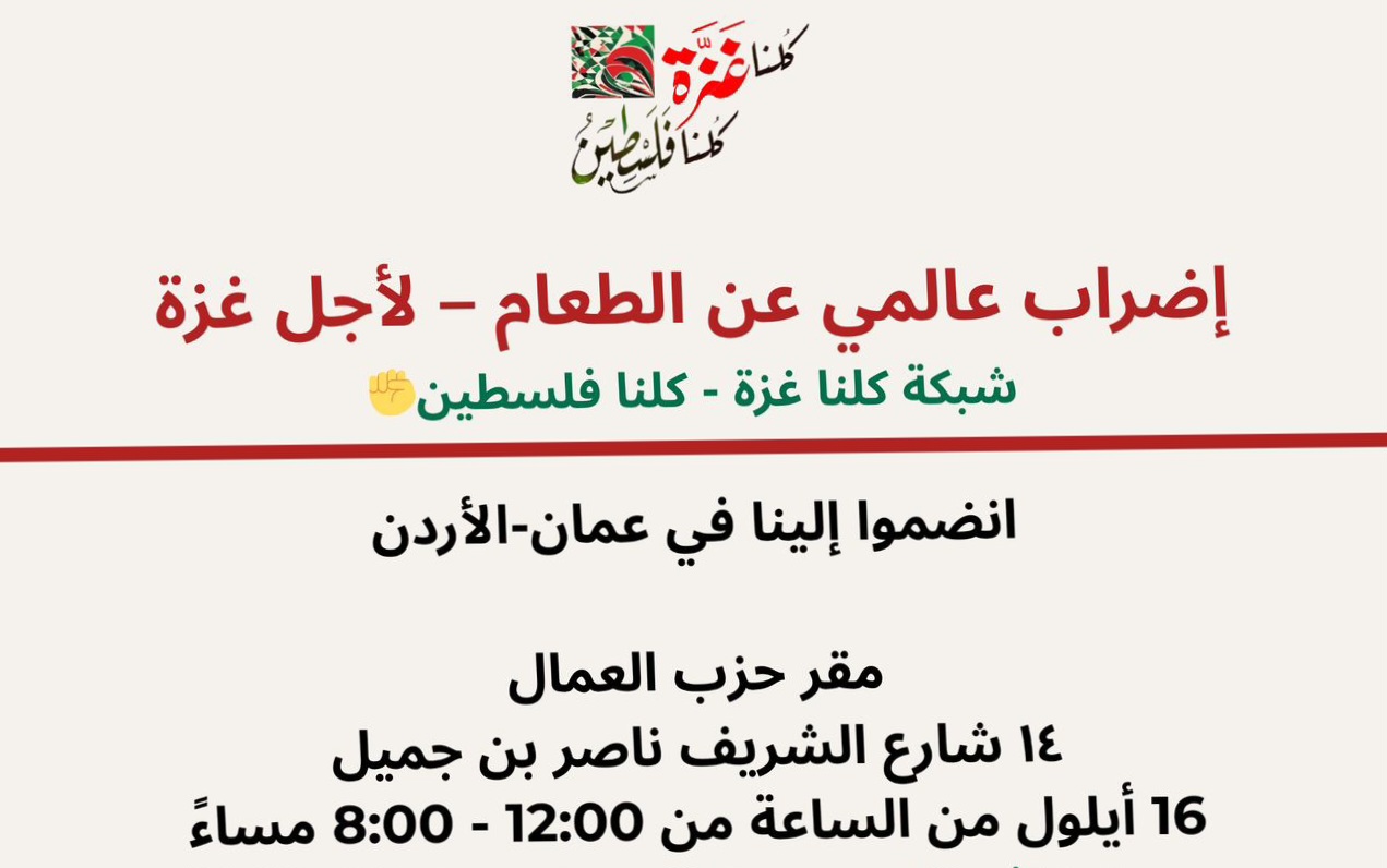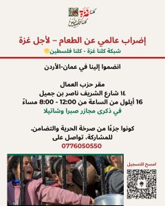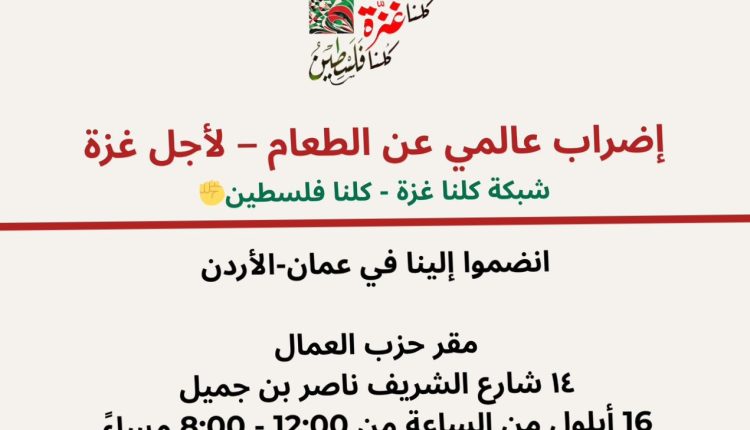 تلبية لنداء شبكة كلنا غزة – كلنا فلسطين : حزب العمال الأردني يدعو لإضراب عالمي عن الطعام نصرة لغزة وفلسطين