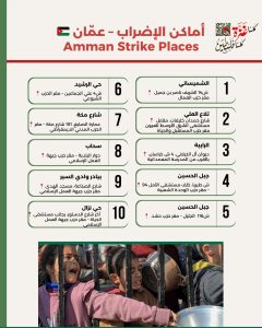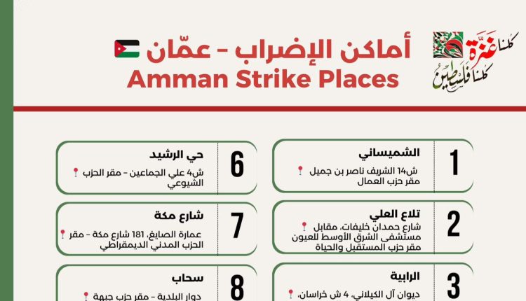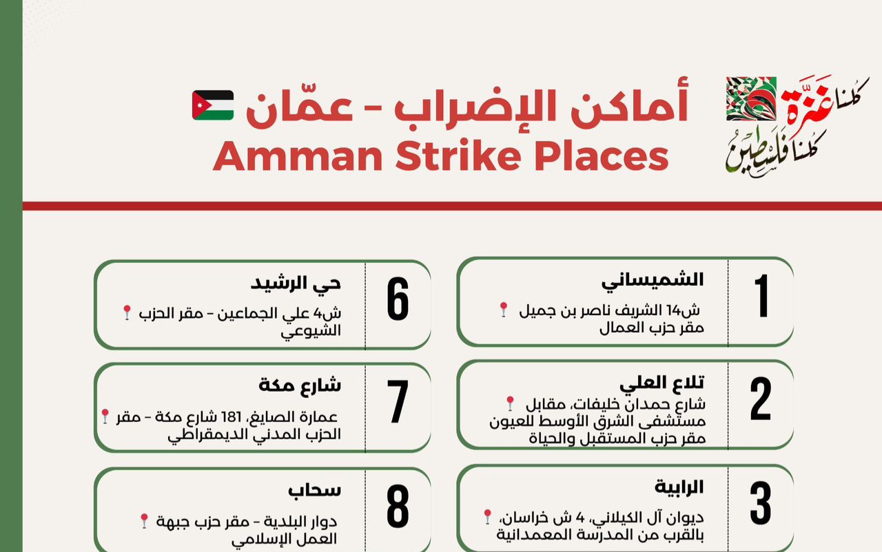 وفيما يلي عناوين مقرات الاحزاب المشاركة في الاضراب والمفتوحة للمواطنين للمشاركة فيها في عمان وباقي المحافظات.