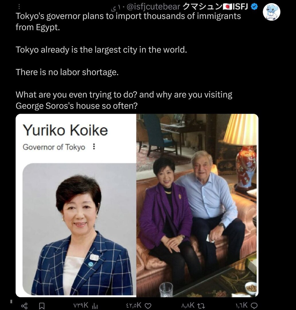 وجاء في المنشور الذي أرفق صورة لقاء سوروس وكويكي في منزله: “يخطط حاكم مدينة طوكيو لاستيراد آلاف المهاجرين من مصر، طوكيو هي بالفعل أكبر مدينة في العالم ولا يوجد نقص في العمالة فيها.. ما الذي تحاولين فعله حتى؟.. ولماذا تترديين على منزل جروج سوروس كثيرا؟!”.