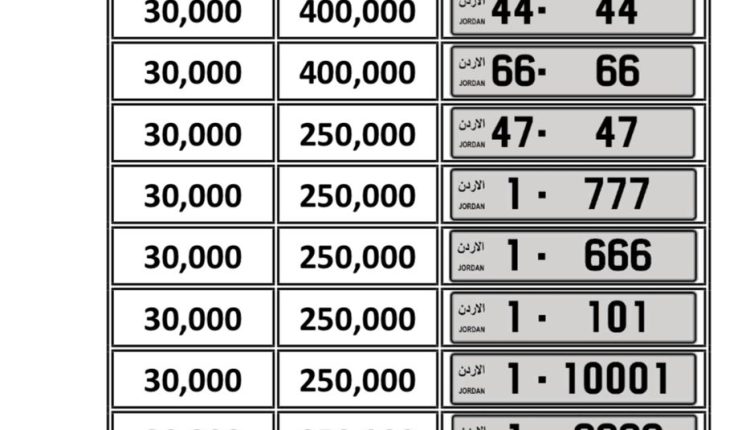 وأضافت اللجنة عدداً من الأرقام ذات ترميز الخانتين وتم طرحها بذات المزاد، فيما أتاحت اللجنة تسجيل ودفع مبلغ التأمين بشكل إلكتروني إضافة للطرق المعلن عنها سابقًا وذلك من خلال إنشاء حساب على البوابة الإلكترونية لإدارة ترخيص السواقين والمركبات على الرابط التالي https://eservices.dvld.gov.jo/