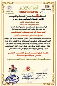 إنها شهادة تخلّد وقوفي مع مظلومية اليمن وشعبه، ومع فلسطين التي تحتفظ بالأمل رغم التحديات والاعتداءات.