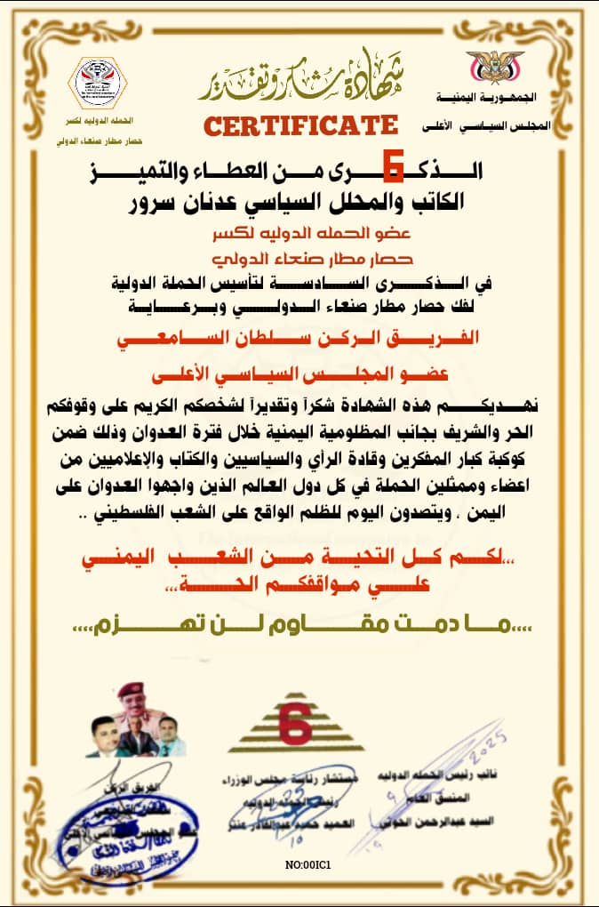 فبقلبٍ يعتلي القمم إجلالًا، ولسانٍ يترفّع عن مجاراة مقامكم، أرفعُ إليكم أسمى آيات الامتنان والعرفان، على ما أوليتموني من شهادة الشكر والتقدير في الذكرى السادسة لتأسيس الحملة الدولية لكسر الحصار عن مطار صنعاء الدولي.
