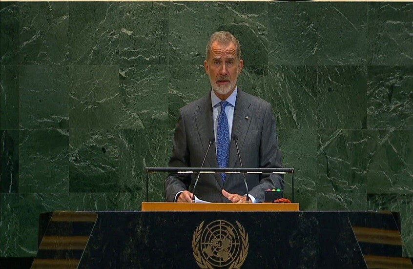 وقال العاهل الإسباني في كلمته أمام أعمال الجمعية العامة للأمم المتحدة اليوم الأربعاء: “لا يمكن أن نغض الطرف عن قتل المدنيين وتهجير مئات الآلاف في قطاع غزة، ونطالب إسرائيل بوقف القتل في غزة وتطبيق القانون الدولي الإنساني”.