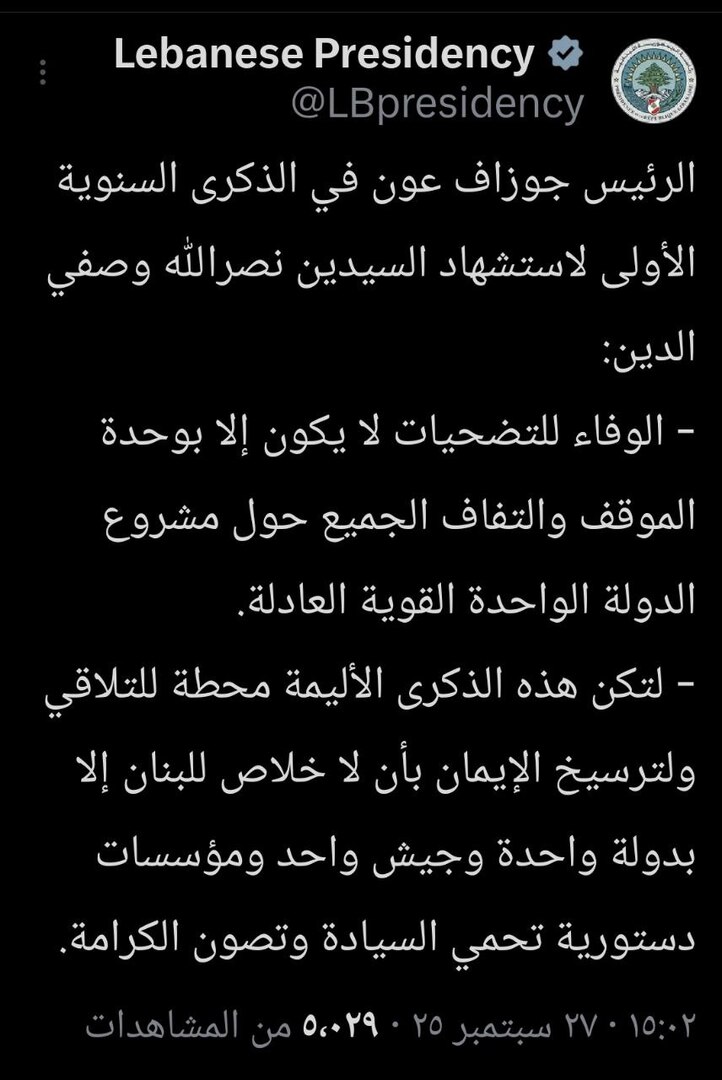 وكتب حساب رئاسة الجمهورية اللبنانية عبر منصة “إكس”: “الرئيس جوزيف عون في الذكرى السنوية الأولى لاستشهاد السيدين نصرالله وصفي الدين: الوفاء للتضحيات لا يكون إلا بوحدة الموقف والتفاف الجميع حول مشروع الدولة الواحدة القوية العادلة”.