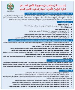 مديرية الأمن العام / إدارة شؤون الأفراد – مركز تجنيد الأمن العام تعلن عن حاجتها لتجنيد عدد من الذكور والاناث