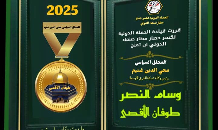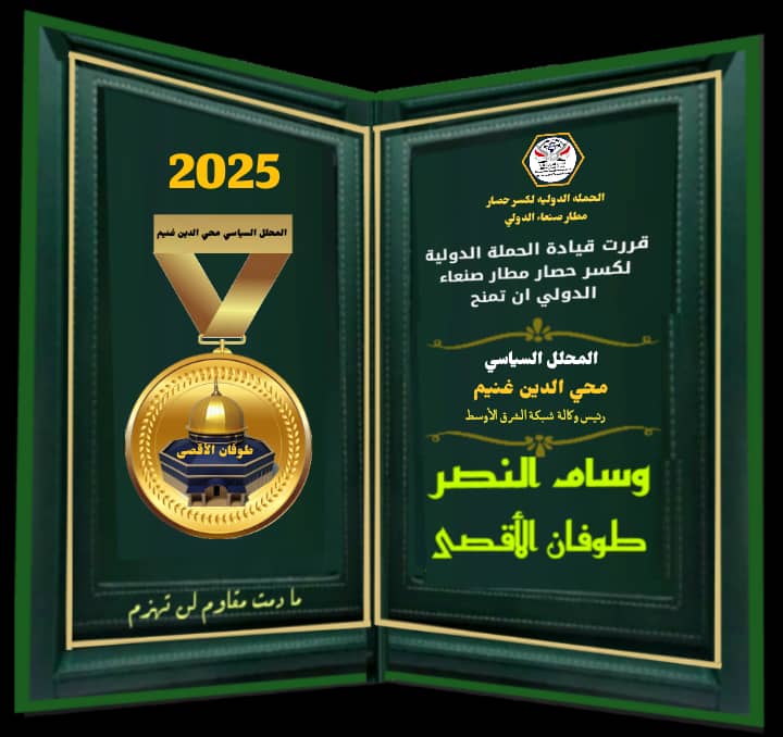 شبكة الشرق الأوسط نيوز : قيادة الحملة الدولية لكسر حصار مطار صنعاء الدولي ممثله بالاخ العميد /حميد عبد القادر عنتر رئيس الحملة الدولية لكسر حصار مطار صنعاء الدولي والاخ عبد الرحمن الحوثي نائب رئيس الحملة الدولية المنسق العام والاخ الدكتور مراد الصادر رئيس الفريق الاجنبي للحملة الدولية لكسر الحصار والاخ خالد الشايف مدير مطار صنعاء الدولي رئيس الفريق الميداني للحملة الدولية لكسر الحصار عن مطار صنعاء الدولي، للإعلامي ” محي الدين غنيم ” مسؤل وكالة الشرق الأوسط نيوز عضو الحملة الدولية لكسر حصار مطار صنعاء الدولي درع النصر وذلك لمواقفه الوطنية مع نشر مظلومية فلسطين واليمن ولبنان والعراق والجمهورية الاسلامية للعالم وفضح جرائم الحرب الذي ارتكبها الكيان اللقيط مدعوم من واشنطن والدول المطبعة ونتمنى لكم التوفيق في مهامكم