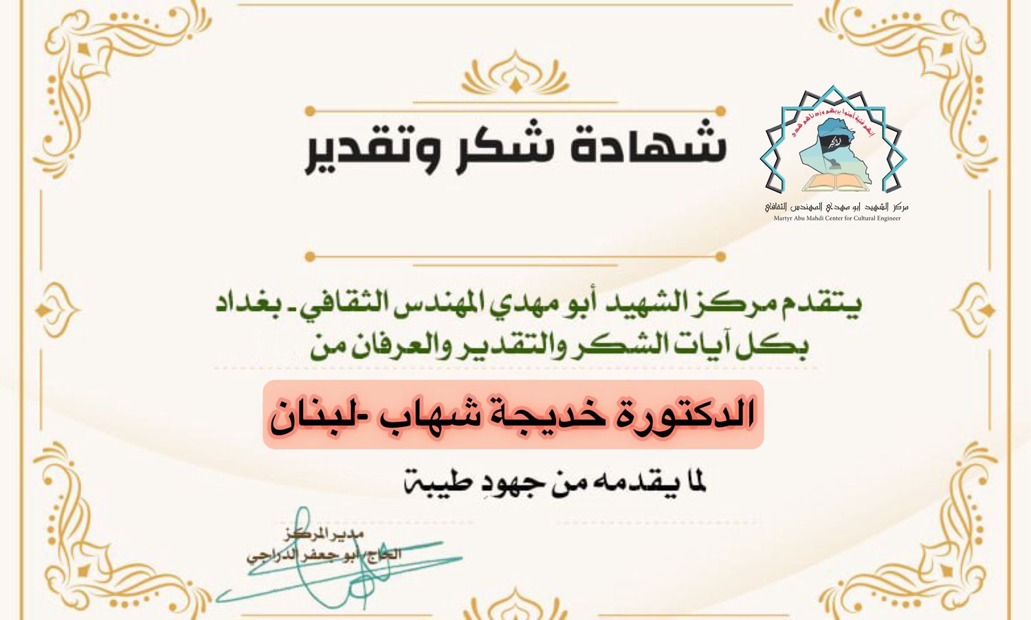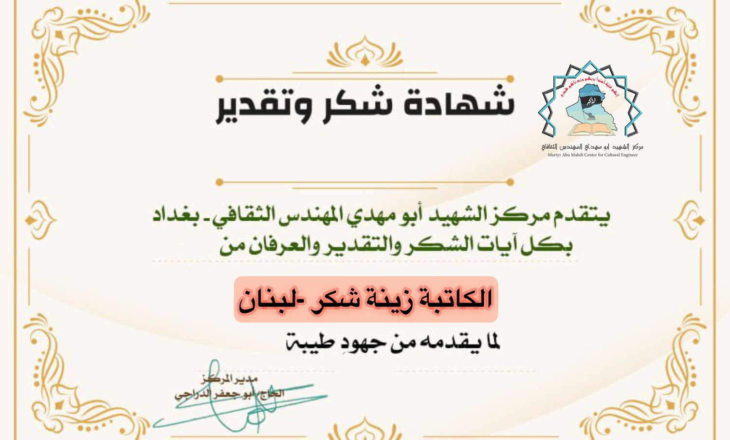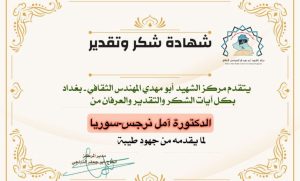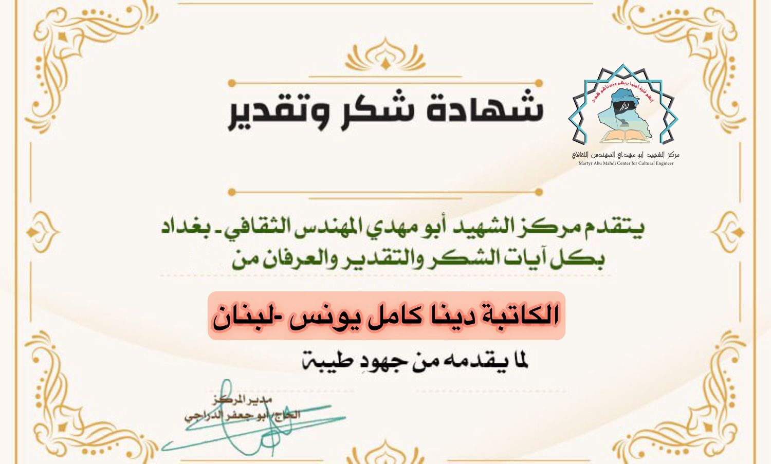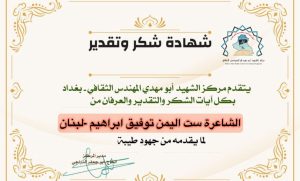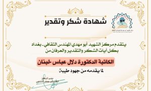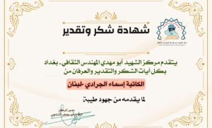 الاخت الدكتورة سوزان الزين المستشار الثقافي لمركز الشهيد ابو مهدي المهندس مرفق لكم كشف بأبرز الكُتاب والكاتبات و رؤساء المواقع والوكالات الدولية أرجو منحهم تكريم كما عهدناكم