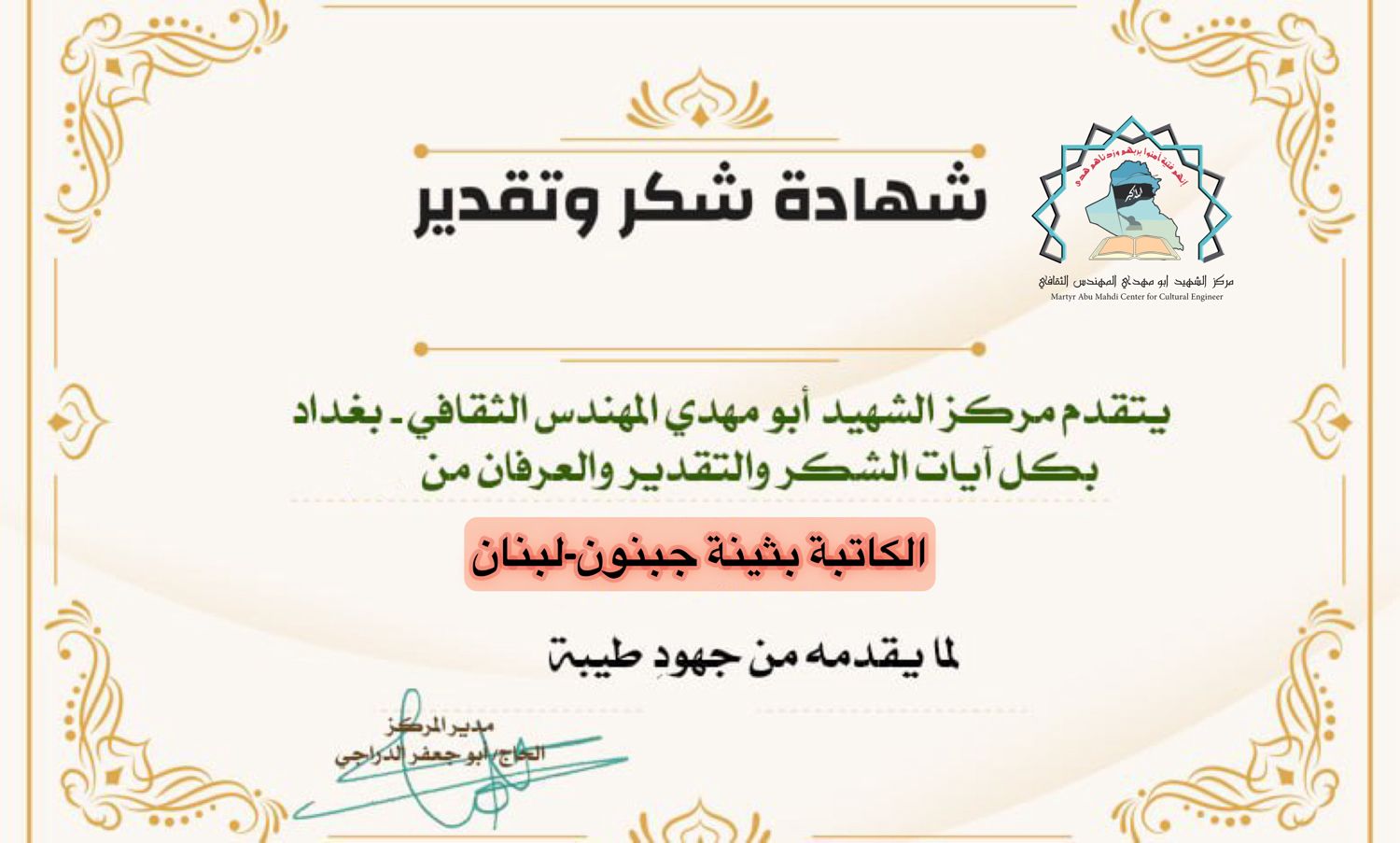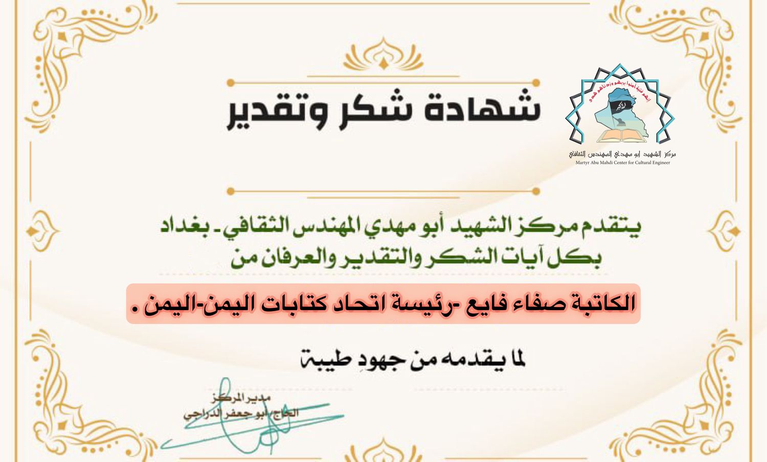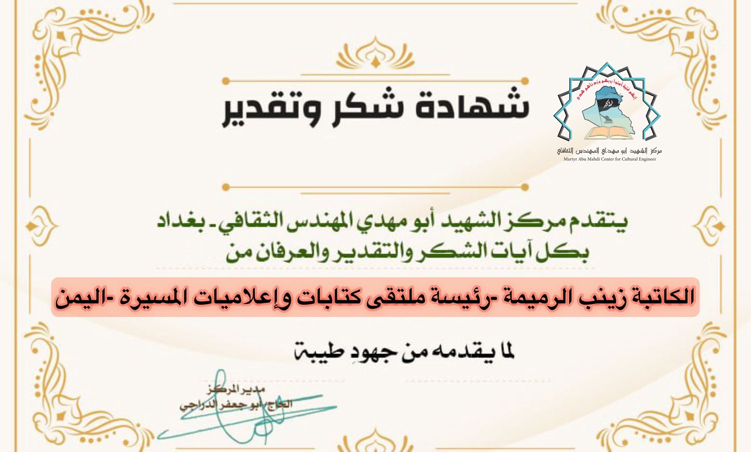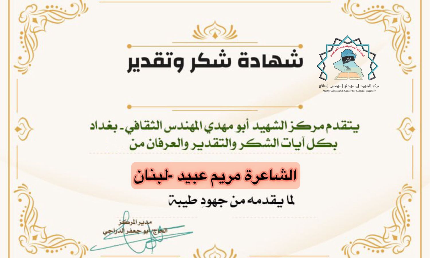 الاخت الدكتورة سوزان الزين المستشار الثقافي لمركز الشهيد ابو مهدي المهندس مرفق لكم كشف بأبرز الكُتاب والكاتبات و رؤساء المواقع والوكالات الدولية أرجو منحهم تكريم كما عهدناكم