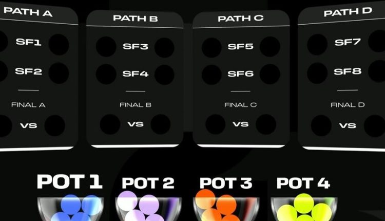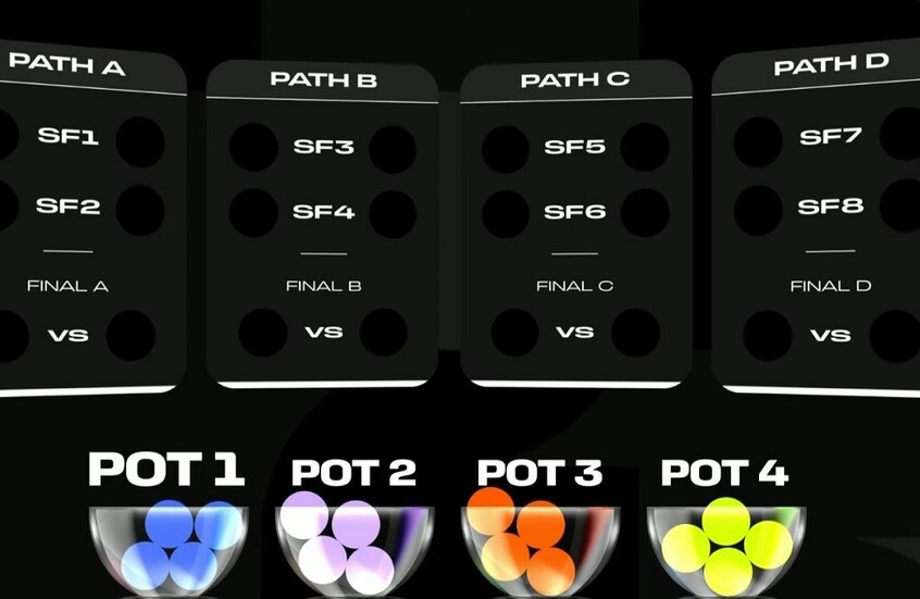تبدأ القرعة بالوعاء 1 وتنتهي بالوعاء 4. ويتم تشكيل مسارات التصفيات الأربعة على النحو التالي: