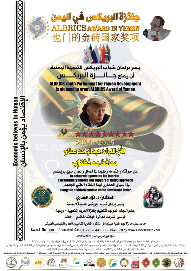 شبكة الشرق الأوسط نيوز : اللوا/عبد الواحد صلاح محافظ اب الرجل الاول في المحافظة وممثل رئيس الجمهورية في المحافظة يتم منح جائزة البريكس لعام 2025من الدكتور فؤاد الغفاري ممثل دول البريكس ومؤسس جائزة البريكس في اليمن الف الف مبروك للاخ اللواء عبد الواحد صلاح محافظ اب يستحقها بجدارة لانه رجل السلام الاول في المحافظة وقاد المحافظة في أصعب المحطات التاريخية الى بر الامان الف الف مبروك ونتمنى له التوفيق