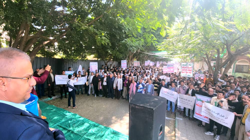تلبية للواجب الديني والأخلاقي الملقى على عاتق كافة أبناء الأمة واستجابة لدعوة سماحة السيد القائد عبدالملك بن بدر الدين الحوثي رضوان الله عليه أقيمت صباح اليوم بجامعة إب مسيرة حاشدة بمشاركة جموع غفيرة من الأكاديميين والإداريين والطلبة وفي مقدمتعم رئيس الجامعة الأستاذ الدكتور نصر الحجيلي ونواب رئيس الجامعة الأستاذ الدكتور عبدالله الفلاحي والأستاذ الدكتور فؤاد حسان والأستاذ الدكتور أحمد أبو لحوم وأمين عام الجامعة الأستاذ عبدالملك السقاف وعمداء الكليات والمراكز ومدراء العموم وأعضاء هيئة التدريس والموظفين والطلبة وممثلي الملتقى الطلابي.
