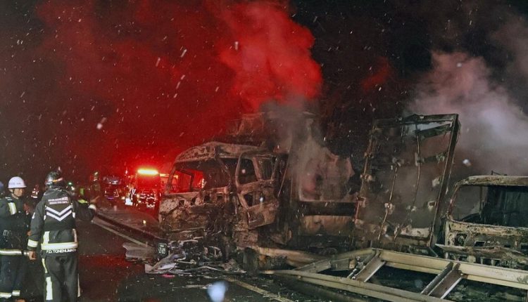 وأدى اصطدام الشاحنتين إلى إغلاق أجزاء من الطريق السريع، ولم تتمكن السيارات القادمة من خلفهما من استخدام المكابح على السطح الثلجي. وقالت الشرطة إن هذا التصادم المتسلسل ضم أكثر من 50 مركبة.