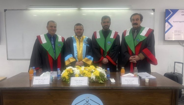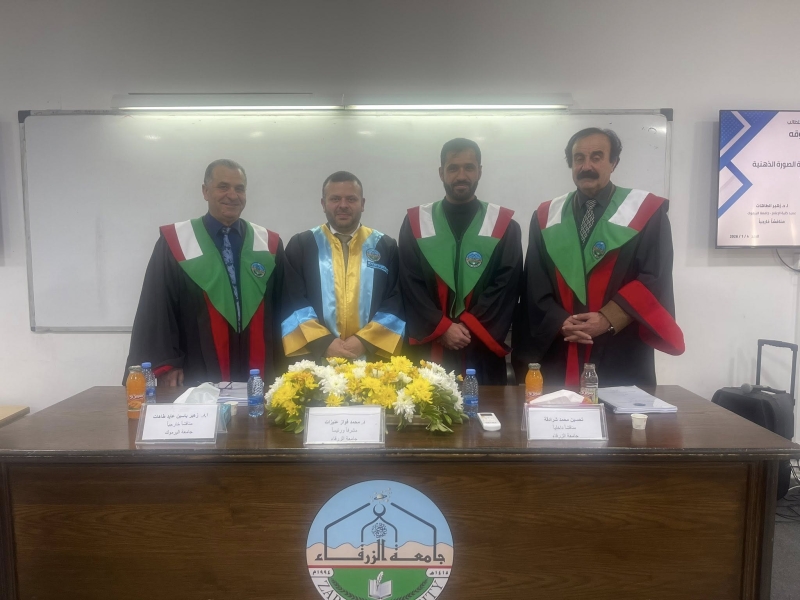 وقد تشكلت لجنة المناقشة من الدكتور محمد العنيزات (جامعة الزرقاء) مشرفاً ورئيساً، والأستاذ الدكتور زهير الطاهات، عميد كلية الإعلام في جامعة اليرموك (عضواً خارجياً)، والدكتور تحسين شرادقة من جامعة الزرقاء (عضواً داخلياً).