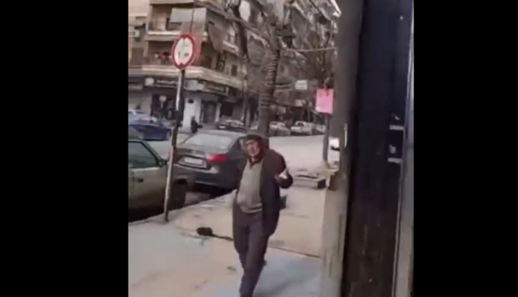 وصور الفيديو المسن وهو يمشي بخطوات هادئة وواثقة ويتوقف ليبحث عن بائع المسكرات، حيث سأل مقاتلا متأهبا: “كان هون بياع مأكولات عجب وين صار”.