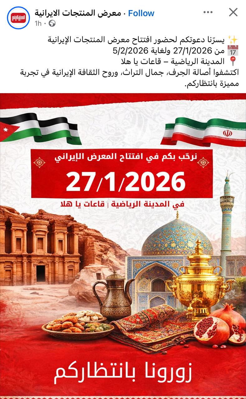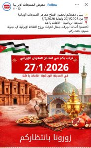 شبكة الشرق الأوسط نيوز – محي الدين غنيم : برعاية معالي السيد حازم قشوع وبحضور سعادة سفير الجمهورية الإسلامية الإيرانية في عمان الأستاذ داود كلانتري وأعضاء السلك الدبلوماسي لدى السفارة وبحضور السفير الفلسطيني المفوض الدكتور فاروق العزة والعديد من البعثات الدبلوماسية والشخصيات من المجتمع الملي ؛ تم إفتتاح اليوم الثلاثاء الموافق 27/1/2026 معرض المنتجات الإيرانية؛ حيث شارك العديد من كبرى المصانع والشركات الإيرانية المتميزة؛ وسيستمر المعرض لغاية 5/2/2026 .