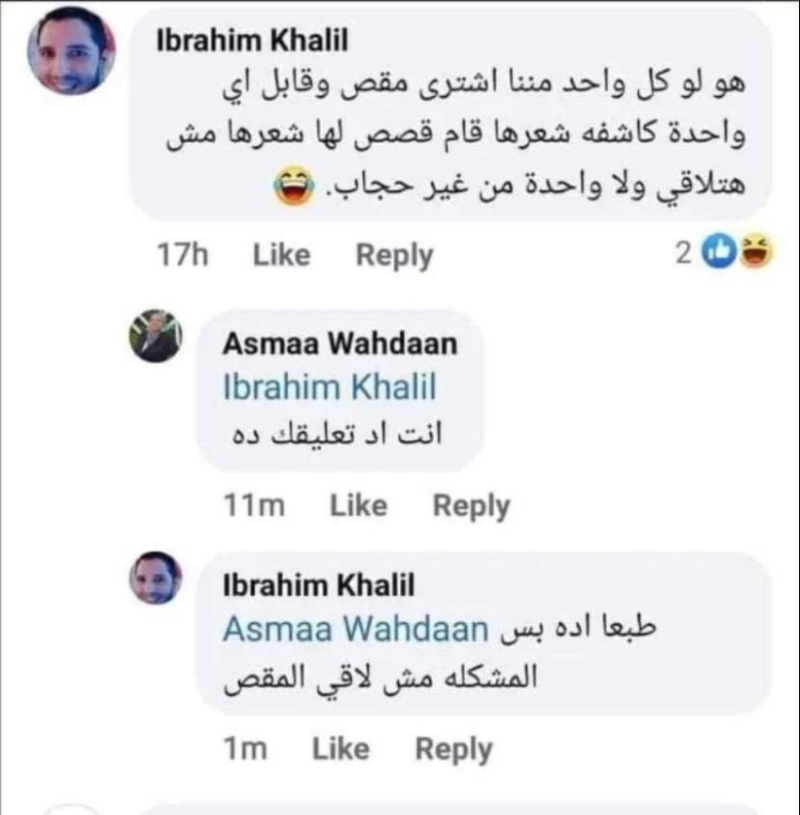 وفي العام 2022 كتب الشاب المصري إبراهيم خليل على حسابه: “لو كل واحد مننا اشترى مقصا وقابل أي واحدة كاشفة شعرها قام قاصص لها شعرها مش هتلاقي ولا واحدة من غير حجاب”.