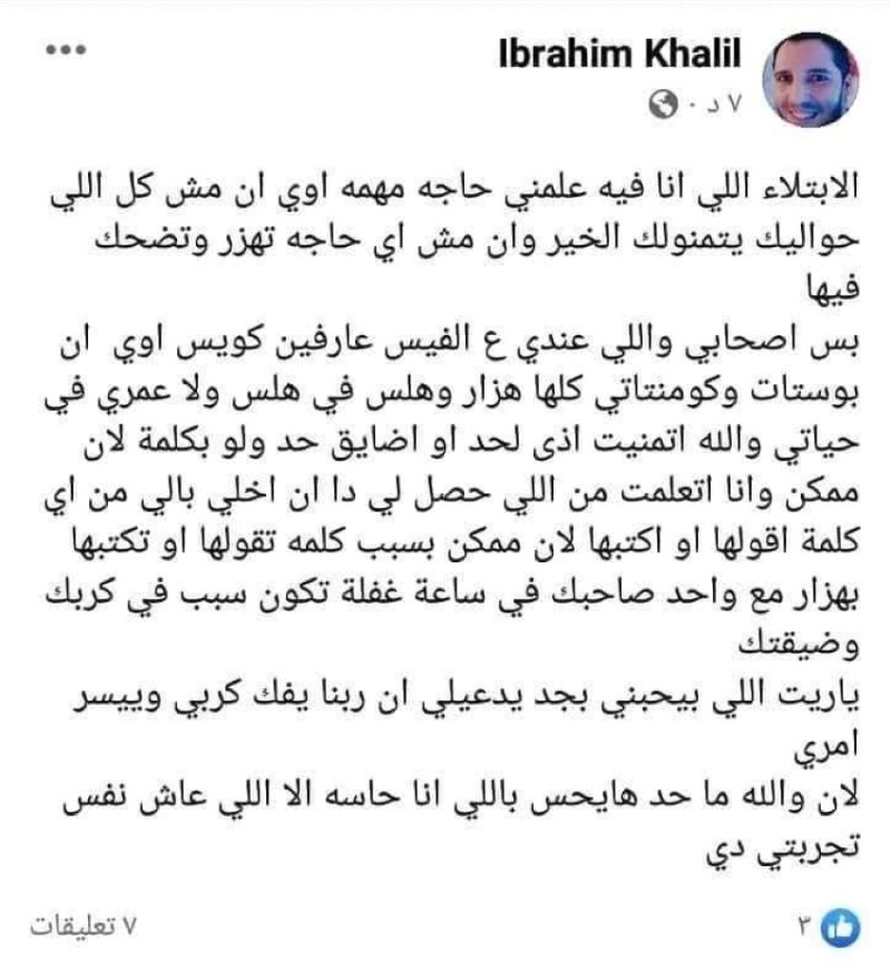 وكتب الشاب إبراهيم خليل، على صفحته بفيسبوك: “الابتلاء اللي أنا فيه علمني حاجه مهمة أوي، إن مش كل اللي حواليك يتمنوا لك الخير، وإن مش أي حاجة تهزر وتضحك فيها، بس أصحابي واللي عندي على الفيسبوك عارفين كويس أوي إن البوستات والكومنتات كلها هزار وهلس في هلس، ولا عمري في حياتي والله تمنيت أذى لحد أو أضايق حد ولو بكلمة”.