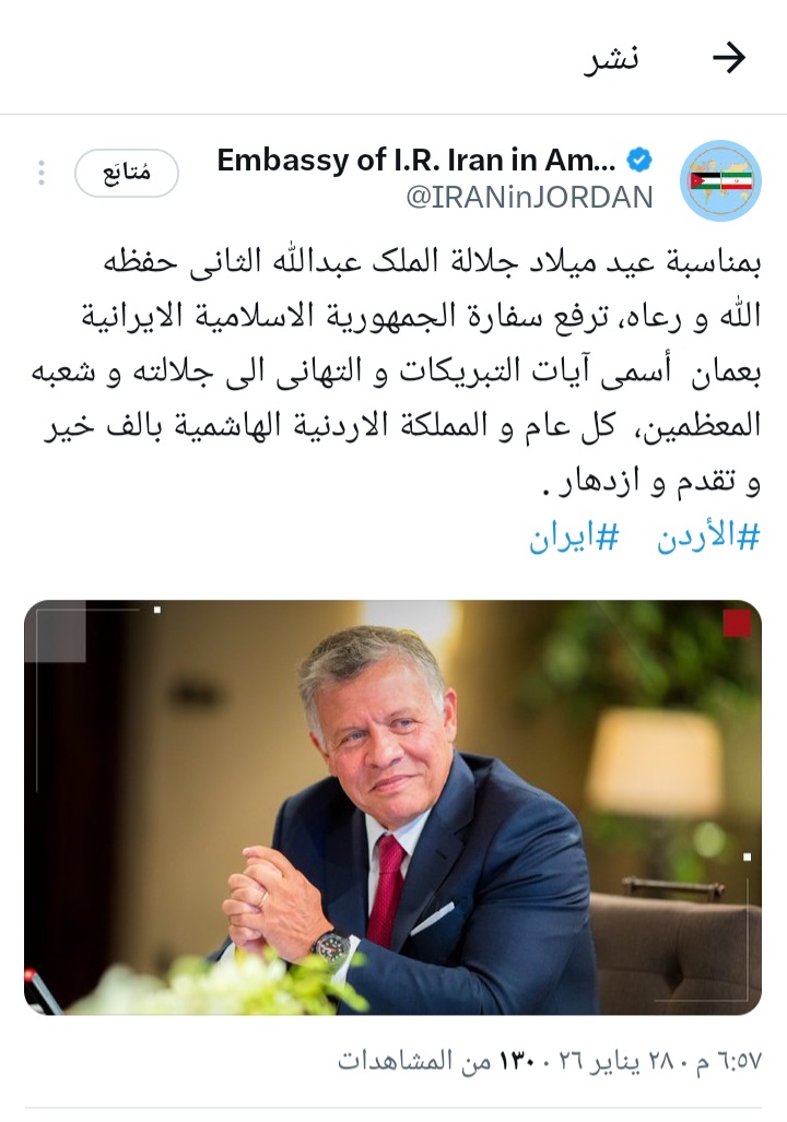 شبكة الشرق الأوسط نيوز : سفارة الجمهورية الإسلامية الإيرانية في عمان تهنئ جلالة الملك بمناسبة عيد ميلاده الميمون .. وتاليا نص الرسالة التي نشرت على منصة X