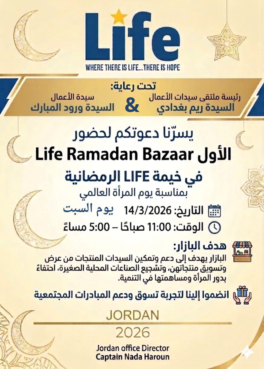 شبكة الشرق الأوسط نيوز : برعاية رئيسية ملتقى سيدات الأعمال السيدة ريم بغدادي وسيدة الأعمال السيدة ورود المبارك ؛ يسر مكتب لايف الأردن دعوتكم لحضور بازار رمضان في خيمة لايف الرمضانية؛ بمناسبة يوم المرآة العالمي وذلك يوم السبت الموافق 14/3/2026