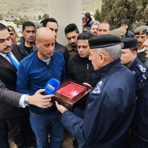شبكة الشرق الأوسط نيوز : شيعت مديرية الأمن العام، بعد صلاة عصر اليوم، شهدائها، الملازم أول مراد اسعود المواجدة والرقيب خلدون أحمد الرقب والعريف صبحي محمد دويكات ، والذين ارتقوا شهداء إلى جوار ربهم بعد إصابتهم أثناء أداء واجبهم خلال مداهمة أحد المطلوبين الخطرين بقضايا المخدرات في منطقة شرق عمان.