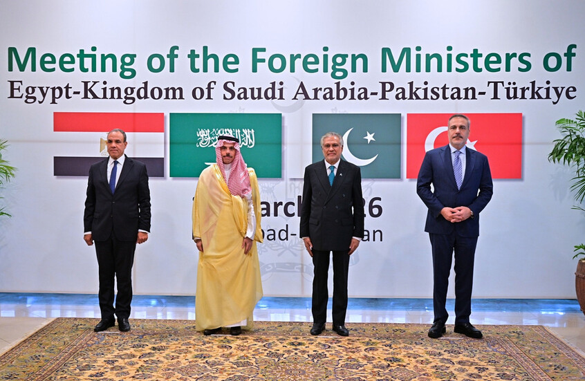 شبكة الشرق الأوسط نيوز : أجرى وزراء خارجية باكستان وتركيا ومصر والسعودية مباحثات في العاصمة الباكستانية إسلام آباد حول سبل تسوية النزاع بين الولايات المتحدة وإيران.