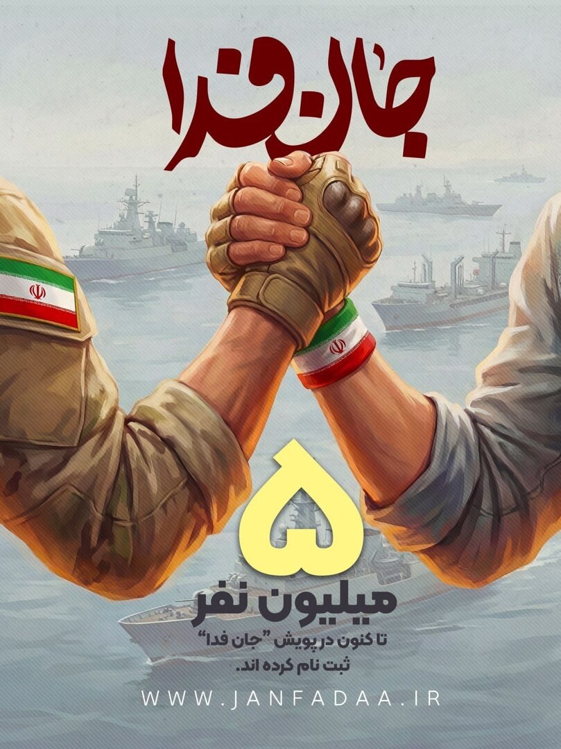وقالت “تسنيم” إنه “خلال أقل من ثلاثة أيام، تجاوزت حملة “جانفدا من أجل إيران” (‘فداء الروح’ من أجل إيران) حاجز الـ 5 ملايين مقاتل متطوع لخوض الحرب الحضارية ضد العدو الأمريكي الصهيوني”، مشيرة إلى طريقة التطوع.