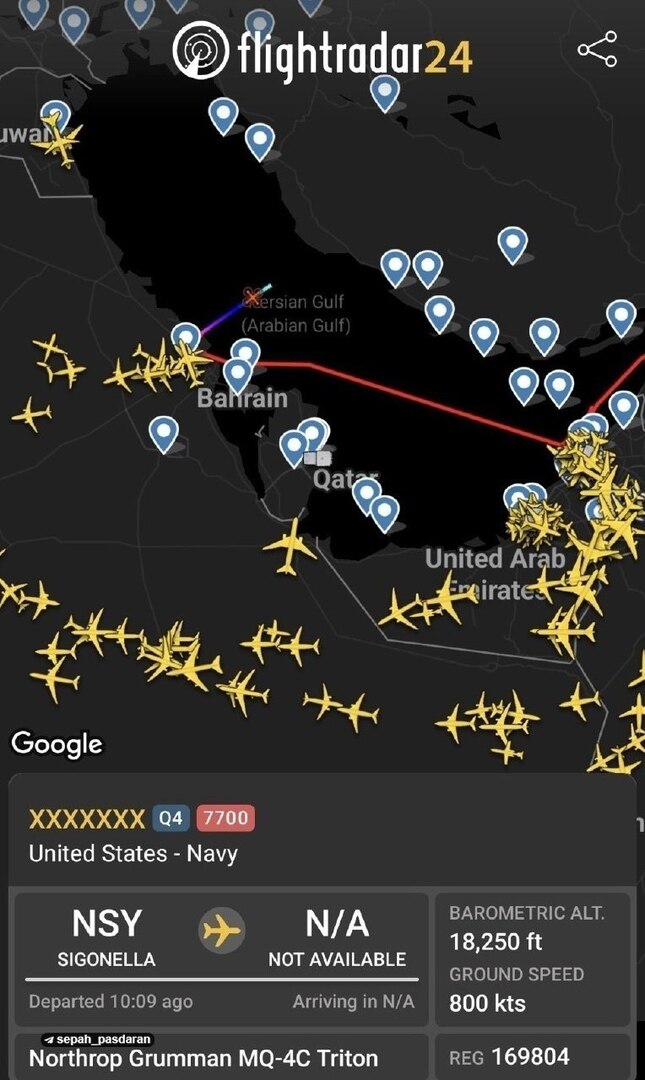 من جانبها، أفادت مصادر إيرانية بأن الطائرة المسيرة الأمريكية من طراز MQ-4C Triton أرسلت إشارة تحذير طارئة (7700) بعد دوريتها فوق الخليج، مشيرة إلى احتمال تعرض الطائرة للإصابة.