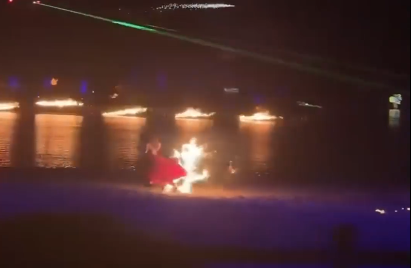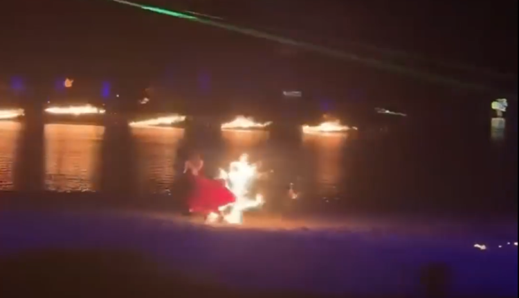 يظهر في المقطع كيف كانت الراقصة مرتدية فستانا طويلا تحيط بحافته من الأسفل حلقة من النار، وعندما ركعت على الرمال لتأدية حركة مميزة، تحول المشهد إلى لحظة مرعبة، واندلعت النار بالفستان ووصلت إلى جسم الراقصة التي هربت مسرعة نحو النهر وألقت بنفسها في الماء.