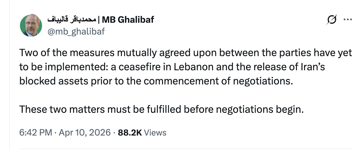شبكة الشرق الأوسط نيوز : أكد رئيس البرلمان الإيراني محمد باقر قاليباف أن وقف إطلاق النار في لبنان والإفراج عن الأصول الإيرانية المجمدة شرطان أساسيان يجب أن يتما قبل انطلاق المحادثات مع الجانب الأمريكي .