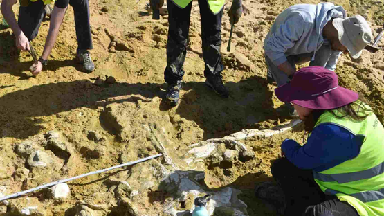 كشفت صخرة طويلة، ظهرت بعد العواصف، عن عظام في شريط ضيق بين الأمواج والرمال، وعملت كارلا توماس، عالمة الحفريات في متحف لورينها، في تلك المنطقة التي نحتتها الأمواج، وساعدت في رفع إحدى الجماجم قبل عودة الأمواج.