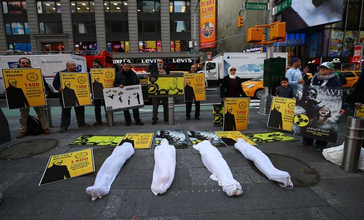 شبكة وهج نيوز : نظمت منظمات مجتمع مدني سورية وقفة احتجاجية في ساحة التايمز الشهيرة، وسط مدينة نيويورك الأمريكية مساء الأربعاء، تنديدا بهجمات نظام الأسد الكيميائية على بلدة خان شيخون.