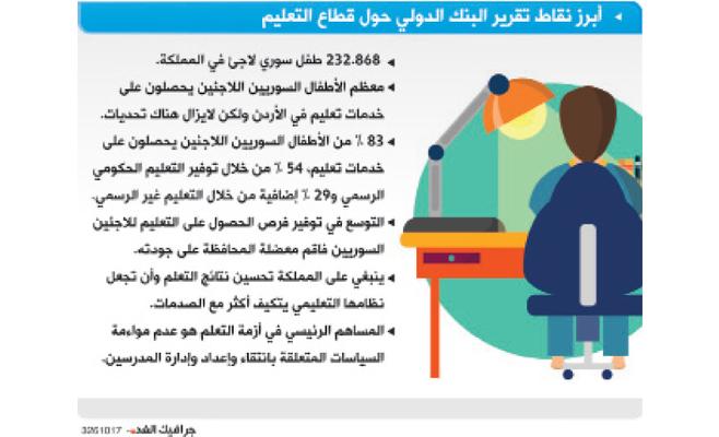 ووفق البنك، فإنّ الحكومة الأردنية التزمت بحماية حق الأطفال السوريين في التعليم، ووفرت خدمات تعليم مجانية لهؤلاء الطلاب من خلال استيعابهم في الفصول الدراسية القائمة، وإنشاء نظام الورديَّتَيْن لتلبية الطلب على التعليم في المدارس.