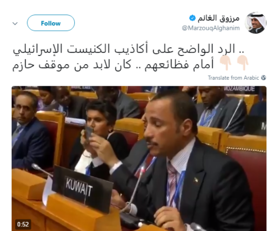 وكان مرزوق الغانم رئيس مجلس الأمة الكويتي وجّه كلمة قاسية إلى ممثل إسرائيل في مؤتمر الاتحاد البرلماني الدولي، حيث وصف إسرائيل بـ”المحتلة وقاتلة الأطفال الفلسطينيين”. وقال لممثل إسرائيل إنه “لو لديه ذرة كرامة لخرج من القاعة”.